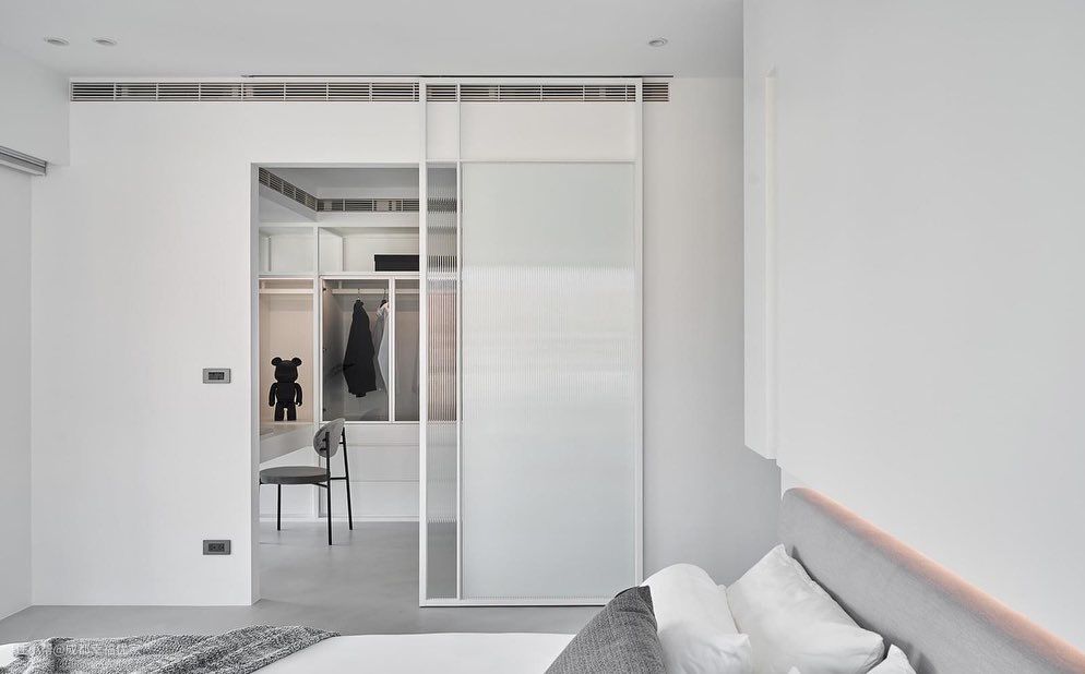 主卧延续了客餐厅的装修风格,简约大气中蕴含高级感。有一个独立的衣帽间,卧室与衣帽间之间使用长虹玻璃推拉门隔断,通透不压抑,且推拉门做了吊柜的设计,更加好清洁。