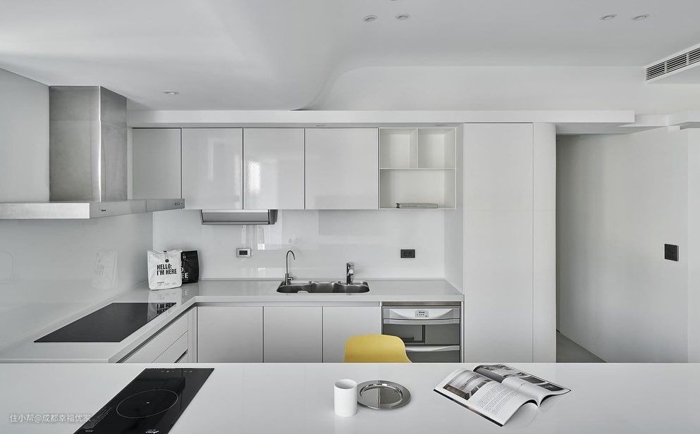 橱柜和吊柜还有台面,都选择了白色的材料,与整个空间的装修风格一致,具有协调美。还选用了吊柜上的一块小区域打造出开放式储物柜,常用的调味品可以放在这里,既不会有放台面上凌乱的感觉,也不会有放柜子里需要经常开柜门的烦恼。