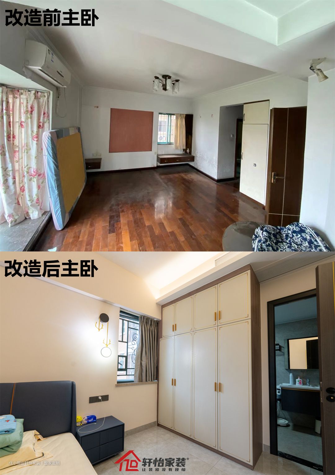 ✿゚改造思路: 1、入户位置缺少鞋柜,由于鞋柜会影响厨房冰箱宽度,所以设计师把鞋柜位置更改,把原来鞋柜空间留给厨房,其次增加入户玄关位的玻璃屏风,增强玄关效果; 2、增加厨房推拉门的位置,让厨房和餐厅视觉效果更加通透,利用厨房原有的格局,让双开门冰箱内嵌在厨房墙体内;厨房外扩到生活阳台,增加厨房原有的使用空间,让橱柜得到有效的延伸延长; 3、利用原有卫生间长度,做出二分离卫生间格局,把卫生间墙体往后延伸到电视背景墙,让走廊原直冲客厅的位置得以遮掩,同时也可以增加电视背景墙的长度,改善由于承重墙造成电视柜过短的问题; 4、主卧没有保留衣帽间位置,通过空间重新规划,把部分空间运用到走廊,增加走廊装饰柜,加强走廊空间感及收纳; 5、更改客厅宽度后,长辈房面积减少,但设计师巧妙的利用榻榻米的柜体定制,制作L型上下床加抽屉式楼梯,既增加收纳储物效果,也保证了上下床的安全; 6、次卧运用榻榻米定制,利用圆窗位置打造同尺寸床体,保证有2M*2M的宽长,解决该空间因格局原因无法摆放正常床体的问题。