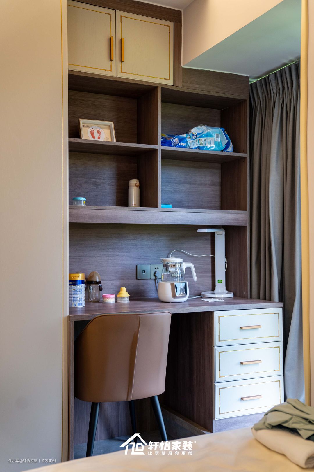 主卧的每1㎡都被设计师精准拿捏了,仅仅利用大飘窗的延伸位和梁柱位,为业主打造了一个不到5㎡的办公区,衣柜+书桌+收纳柜的一体化设计,成就主卧的多元收纳空间。