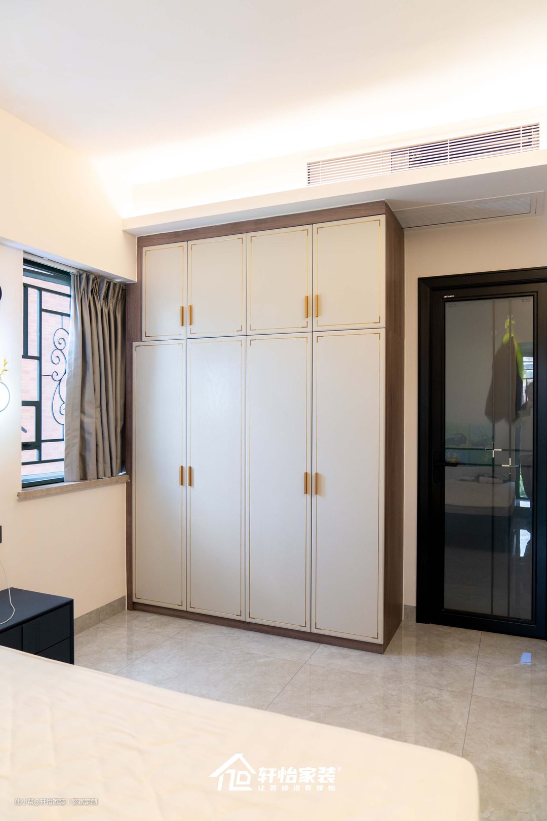 为了实现更多的收纳空间,设计师利用床边靠窗位和床尾靠窗的梁柱位,做了两面到顶定制衣柜设计,储物功能十分丰富,柜面利用白棕两色撞色设计,黄色金属把手点缀,整体视觉素雅又不失格调,与主卧设计保持协调统一。