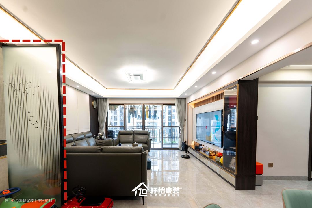应业主装修需求,打造了一个4.6M宽的客厅,采用主灯+筒灯组合设计,特色双眼皮天花用金边点缀,整体视觉高贵轻奢,格调与质感瞬间拉满。