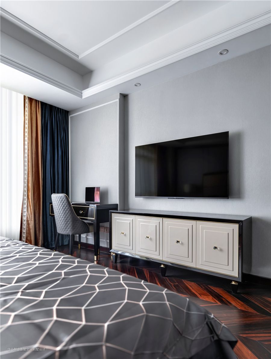主卧卫生间是比较私人的空间,再加上业主平时喜欢泡澡,所以定制浴缸,没事的时候泡个澡,心情也跟着美美哒~ 卧室深色系的人字拼地板,有一种复古的味道。蓝色硬包墙面,提亮整体空间,带来清凉感。