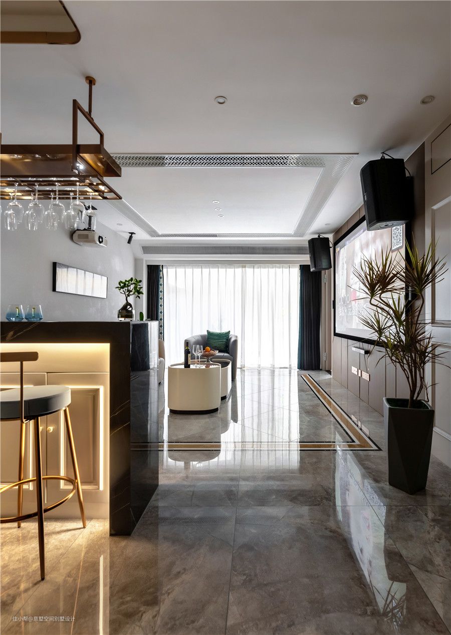 这里是地下室一楼,主要用于休闲娱乐。地下室的规划设计具有多用性,不仅有大大的储物空间,同时娱乐,影视,酒吧,健身,会客,休闲喝茶功能都得到满足。