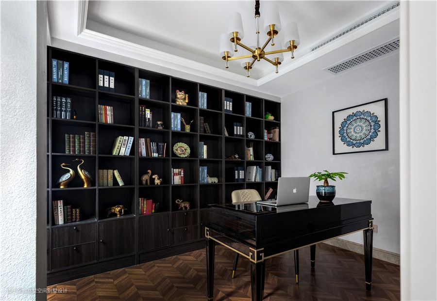书房的地板用了短小的人字拼,为室内增添了一些趣味性。靠墙做了一排书柜,以开放式柜格为主,里面整齐摆放了各类书籍。书桌书椅延用深色系,保持空间的整体性。