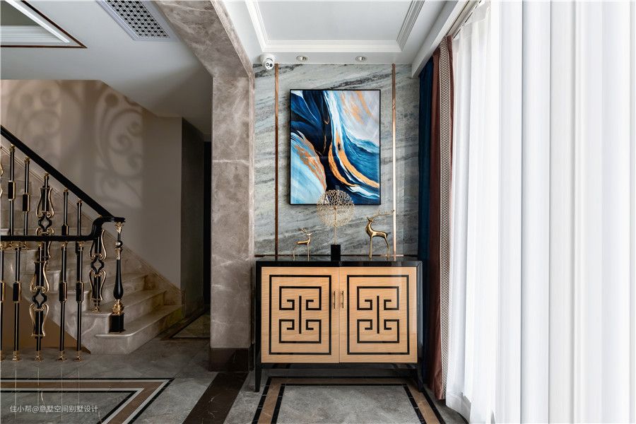 走廊的通道墙做了美化,具有一番观赏滋味。大理石背景嵌入金属线条,增加轻奢感。