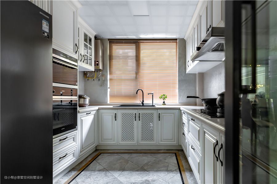 厨房设定在朝北独立区域,使得智能化电器需求全面满足。台面设计的动线按平时做饭的洗、切、炒、放 依次排序,U型布局整个下来动线非常连贯,厨房使用起来也得心应手。木色百叶窗与绿植为厨房带来自然温馨的氛围。