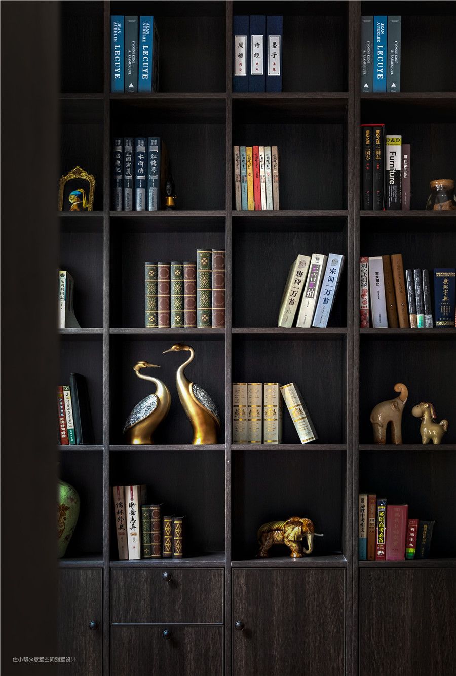 陈列柜近照,半开放式半封闭的设计,有占有露的感觉真的很赞呢!如果深色柜子做成全封闭式的话,反而会给人沉重压抑感呢!柜内有各式各样的书籍,看的出来也是平时也是位知识爱好者呢!