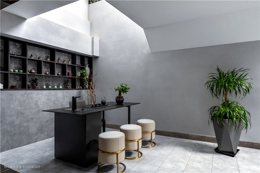 茶水区设计近照,主要是考虑到居住者平时朋友比较多,而且都有喝茶的兴趣爱好。所以将中空花园改造成茗茶室,上墙陈列柜摆放各种茶具,这种设计也很受业主喜爱呢! 茶水吧半镂空的细脚造型独特,搭配米色布艺金属脚的矮脚凳,复古优雅的同时也注入了不少轻奢活力!