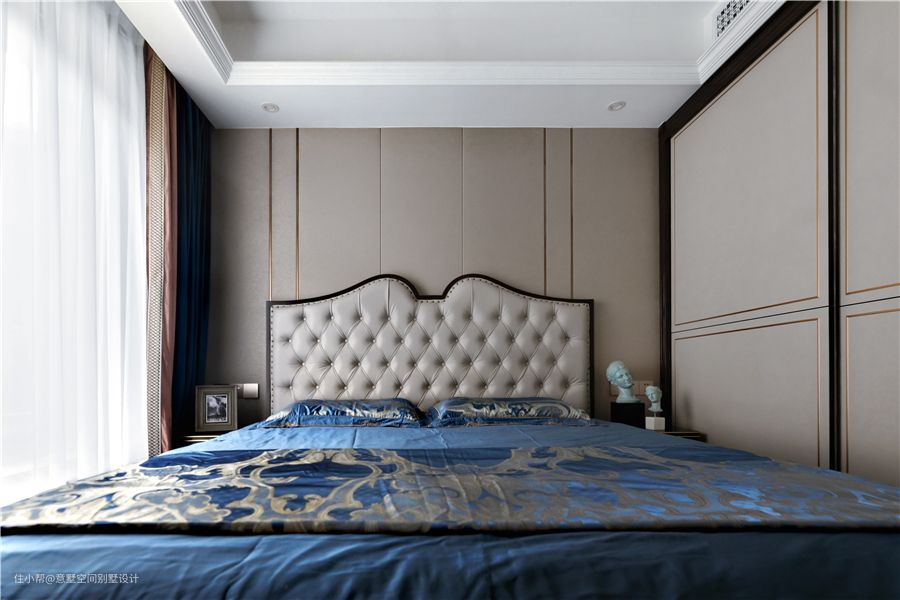 二楼是业主两夫妻的休息场所,室内设有步入式衣库,正符合女主的需求,可以容纳非常大的储物。米色高背床自带贵气,黑色走边作点缀,提升空间轻奢质感。