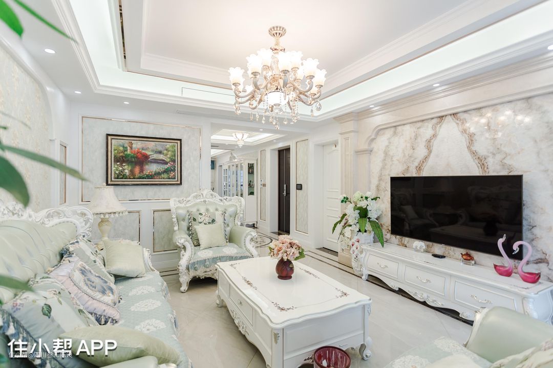 空间以象牙白为主调,浅色系为主深色为辅,没有强烈的的色彩对比的视觉冲击力,一切都是简洁淡雅之感,搭配欧式风格茶几、储物柜、墙面、吊灯,雅致的绿色系花艺与抱枕点缀其中,清新中带着一丝浪漫。