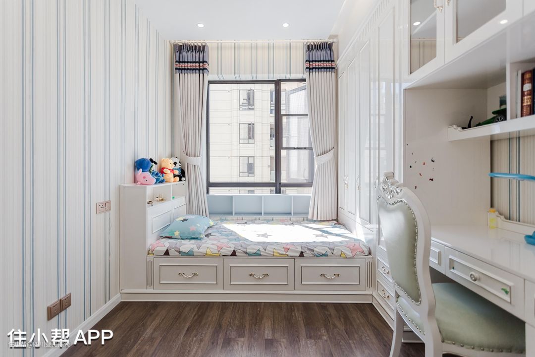 儿童房以米白为主调,床品、墙面、窗帘都是浪漫的米白色,满满的公主气息宽敞通透的飘窗为整体空间带来了更多的可能性,以玩偶与装饰画为区隔,整体协调一致,随意散落的玩偶与抱枕,柔软舒适,浪漫童趣。