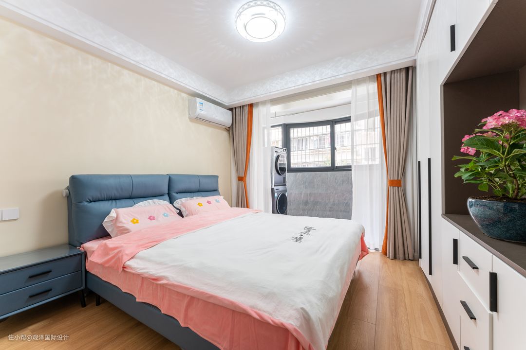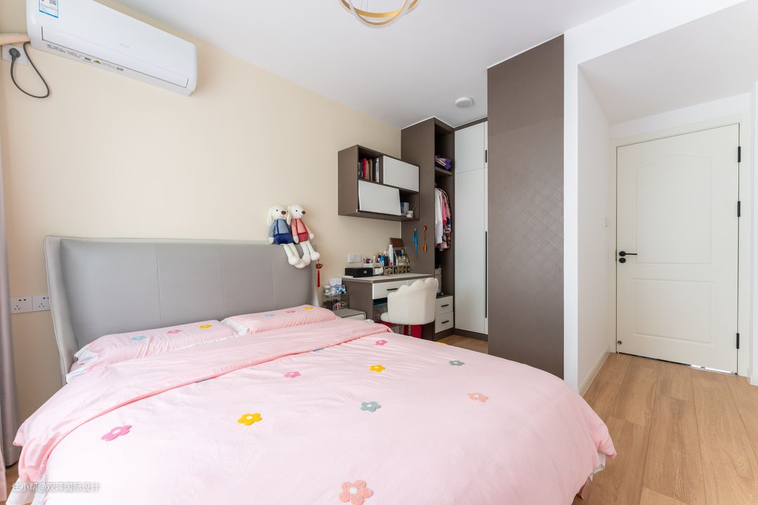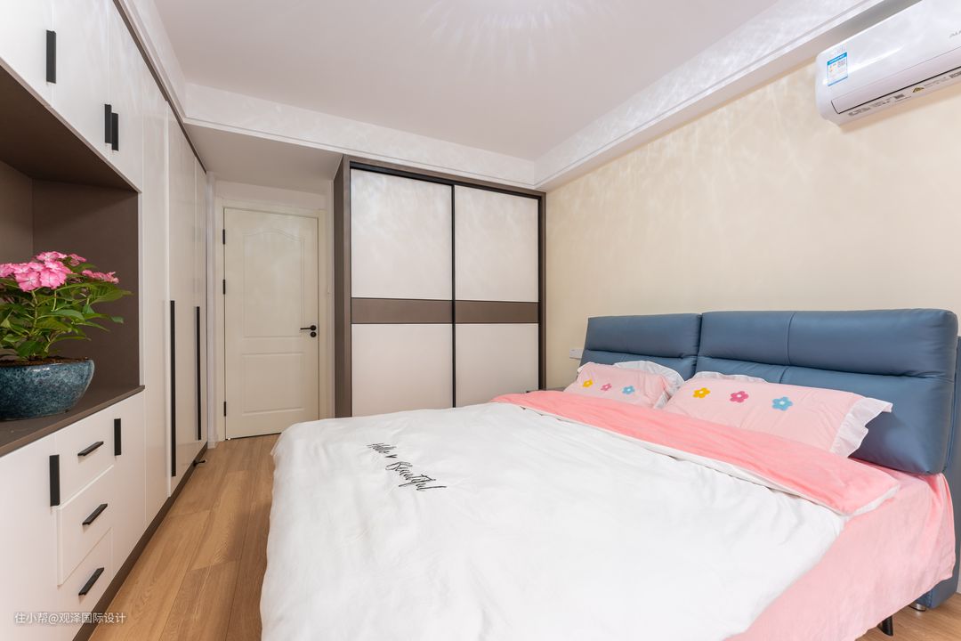低饱和度的米色床头背景,软包床让睡眠没有障碍,值得一提的是,床尾嵌入了一整面墙的收纳柜,完善功能、收纳、面积,给妈妈最佳的舒适度。