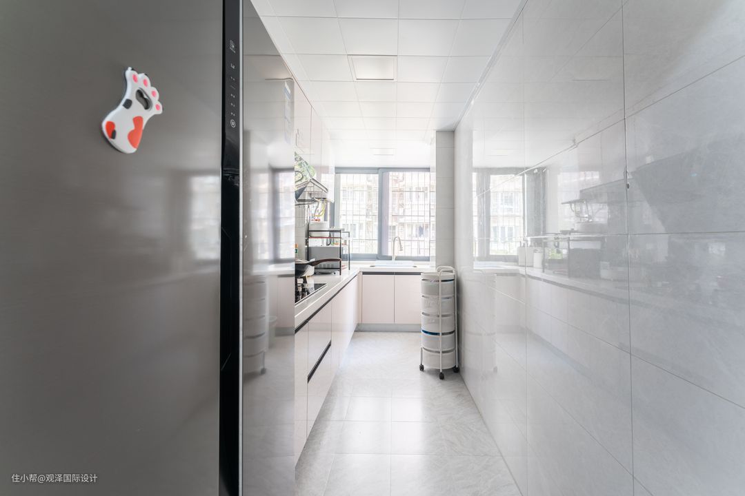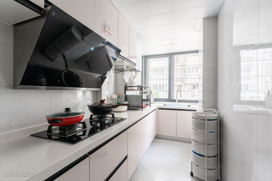 餐厅与厨房相邻,由于户型限制,厨房呈现狭长状态,所以厨房结合空间呈L型布局,保证宽敞的活动空间。 除了上下橱柜,业主还为精心选择了移动式多层收纳篮,不占用空间,也能随时保证流畅的动线。