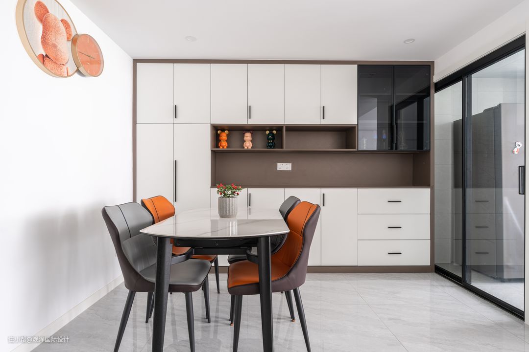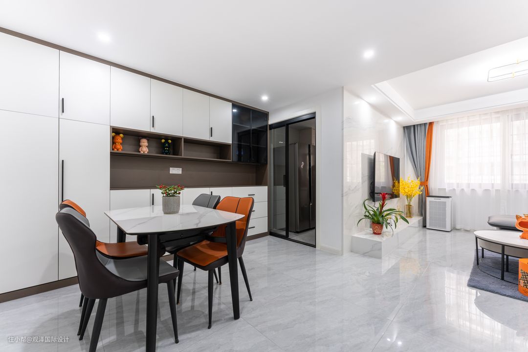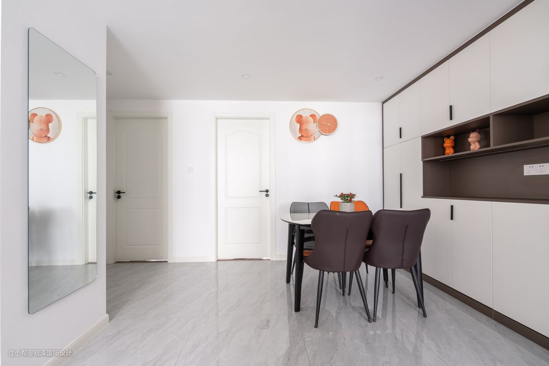 餐厅与客厅之间畅通无阻,由于客厅储物量少,于是餐厅选择做一整面墙的储物柜,补充了公共区的收纳量。