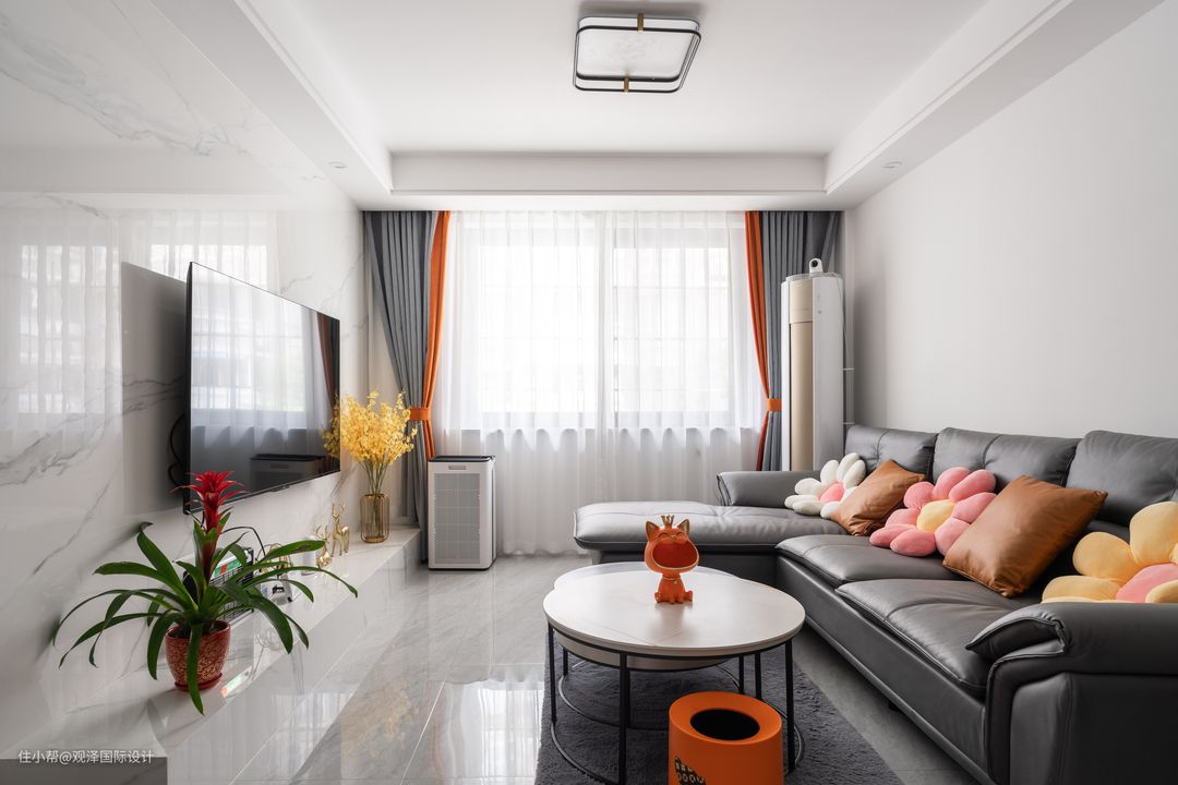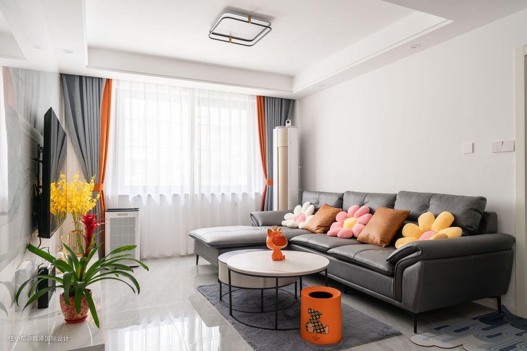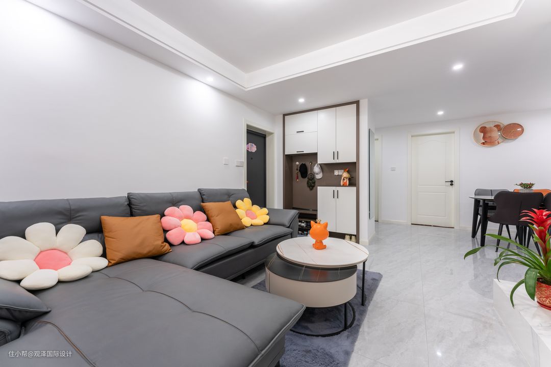 灰色系大气宽敞的7字型皮质沙发,沙发与地毯,错落圆茶几围合成一处午休、聊天、看电视的实用场景功能,选择抬高的支腿,方便打扫;客厅休闲、娱乐、家务量少,完全符合了业主母女二人的需求。 并且全屋都做了相应的柜体,完善家居收纳美学。