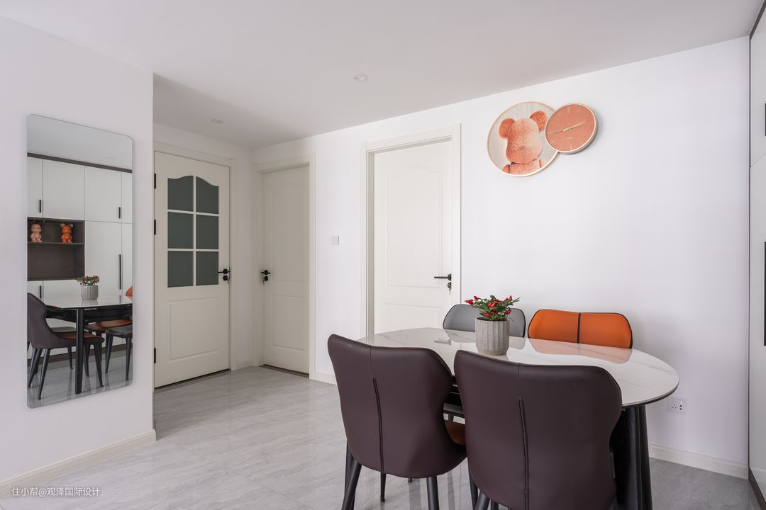 四人规格的椭圆餐桌,足够妈妈单独就餐,母女二人聚餐,或者平时待客的各种可能。餐桌角落放置,避开卧室门,让空间随时保持宽敞畅通,动线更合理。