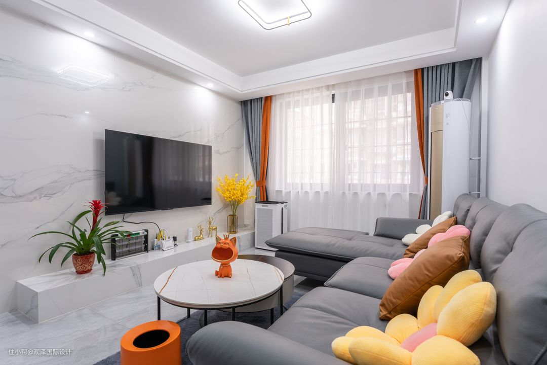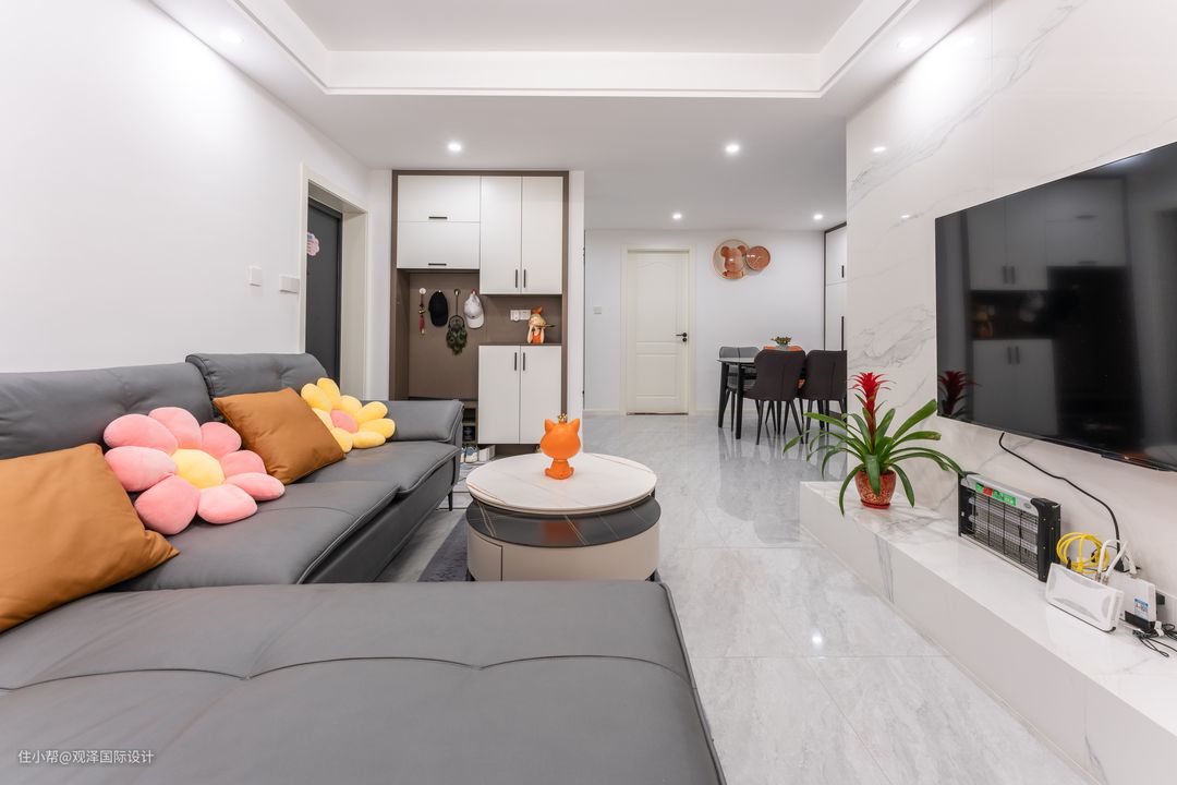 客厅整体以简约易打理为主,电视背景墙+地台设计,减少卫生死角。