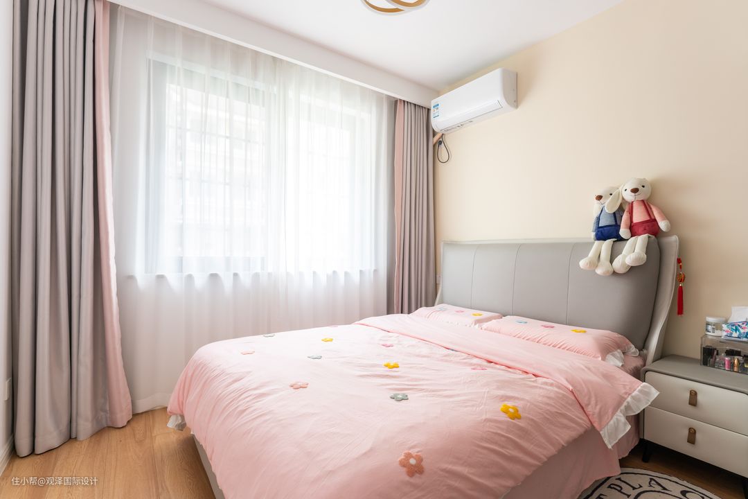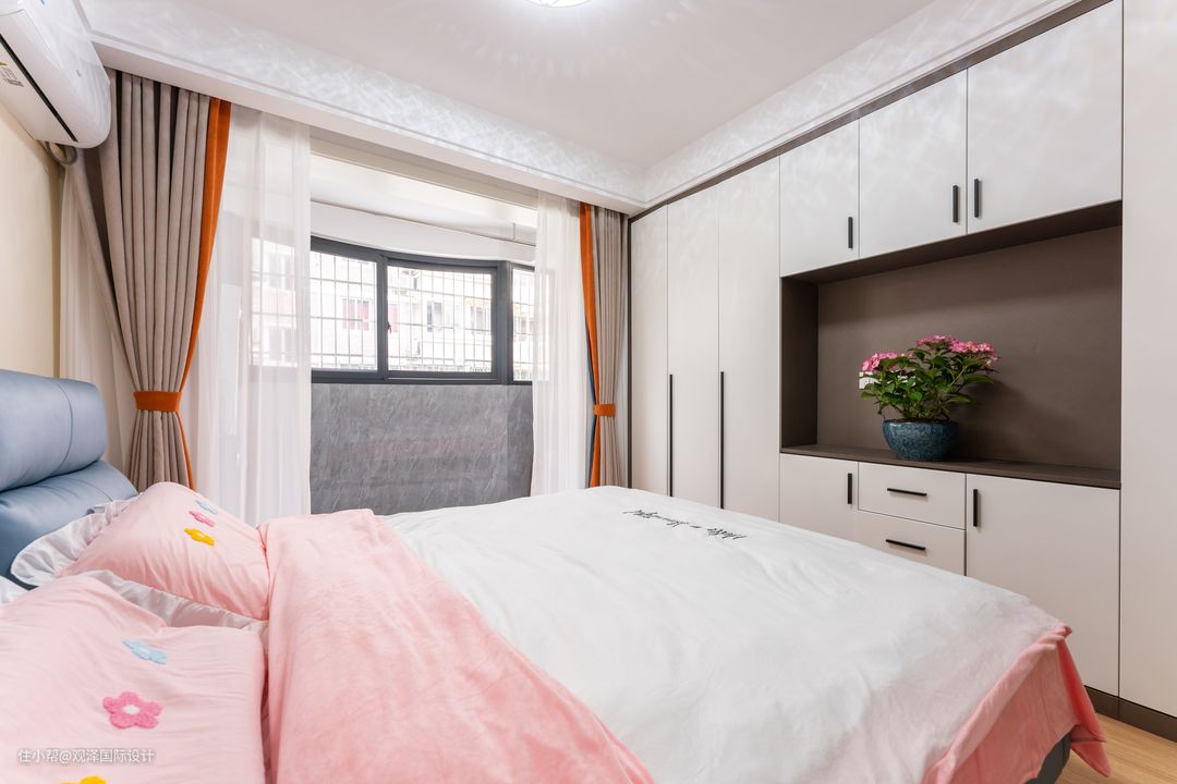 吴小姐的卧室则更贴合年轻女性的喜好,浅橘色、浅咖、珊瑚粉配色,让空间生动而富趣味性,个性温柔而又有朝气。