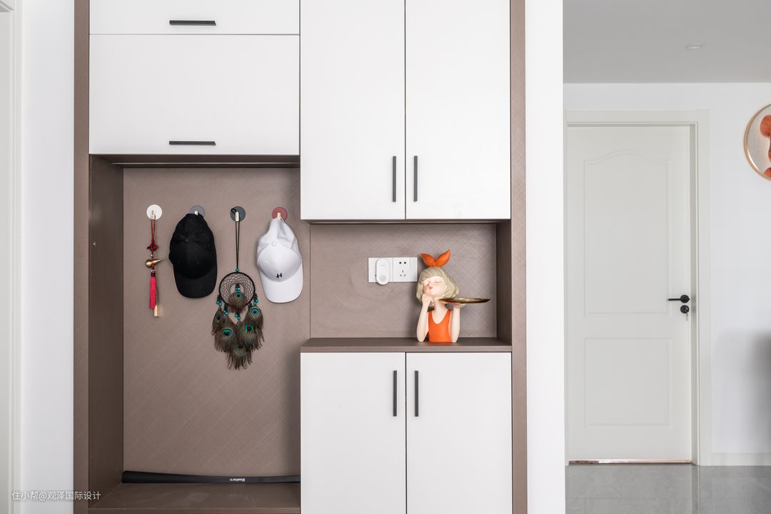 于是,我们在入户左手边的墙体嵌入了玄关柜,顶天立地设计,还将柜体延长至过道,利用卫生间做背靠背柜体设计,收纳实现最大化。 中部开放区方便随手置物,悬挂区兼顾穿鞋凳,悬挂区下通过二级收纳产品(分层鞋架)实现多双日常用鞋的收储;底部抬高约20cm,方便室内拖鞋、换鞋摆放。