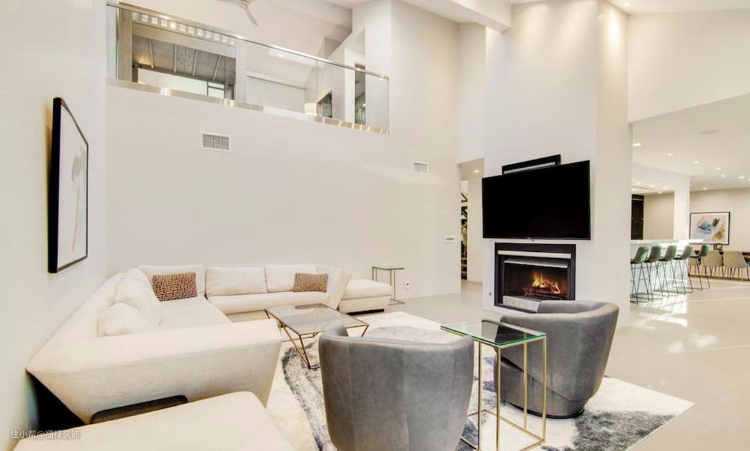 整体空间以白色为基调,墙体MF乳胶漆同色,偏一点淡淡暖色调,搭配浅色的极简布艺沙发,空间飘逸与清新感并存, 阳台纳入客厅,延展视线与使用空间,客厅上方做的挑空处理,空间通透感更加强烈,电视墙下方做墙体镂空,做特色壁炉,让整体空间多了一分高级感!