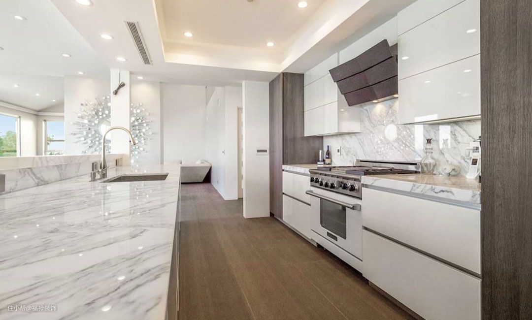 厨房U型布局,整体延续客餐厅的白色基调,吊柜下方设计手扫感应灯,如果做饭比较多的朋友,一定要选配,很实用,避免背光操作的问题