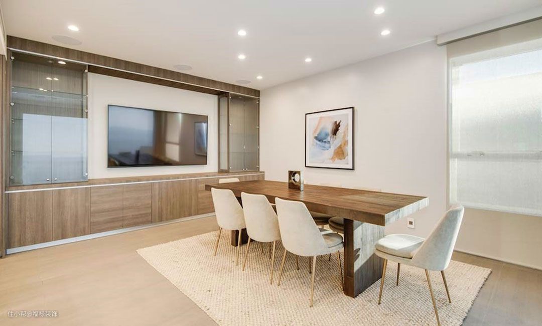 餐厅选配的是胡桃木色T形长条餐桌,座椅配的是布艺贝壳椅,四周墙体刷奶油色乳胶漆,让餐厅氛围更加温馨自然,内墙超大餐边柜和酒柜,四扇超大玻璃门摆放藏酒!
