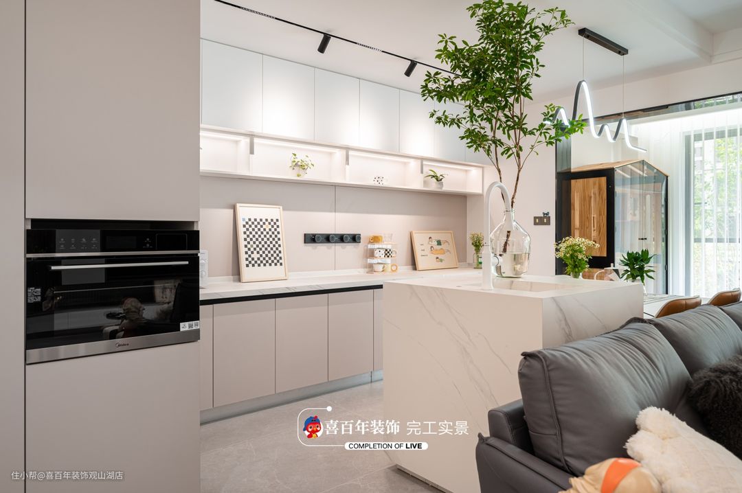 太喜欢餐厅后面这个位置了,既可以做水吧台也可以做西厨台,墙面增加储物空间摆放日常生活的瓶瓶罐罐,既可以当装饰也实用。