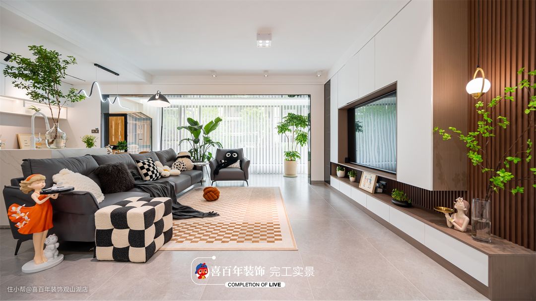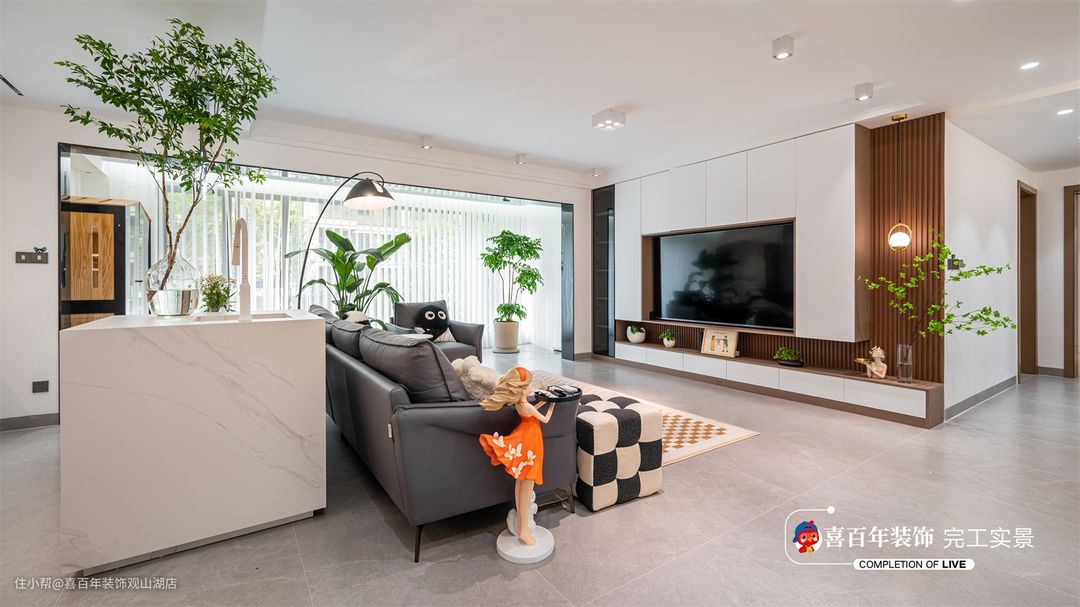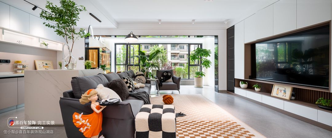 客厅放弃传统客厅桌,留出宽敞的空间,日常女主人运动瑜伽都很宽敞,还可以自由组合沙发位置,随时转换客厅需求。