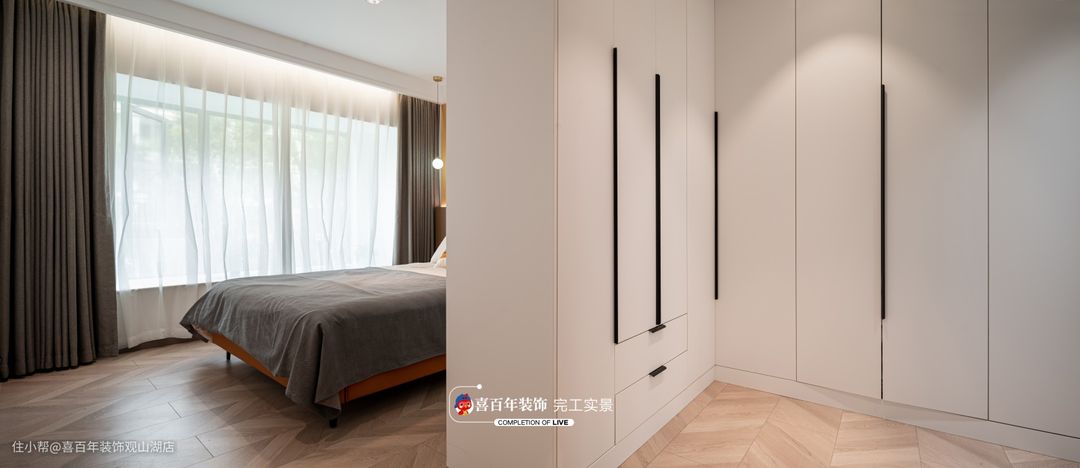 主卧侧面的空间用柜子隔开打造一个分割的衣帽间,把卧室功能的分布区域化,让使用更便捷,白色到顶墙柜无论是收纳还是颜值都比较经得住考验。