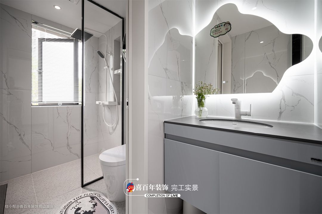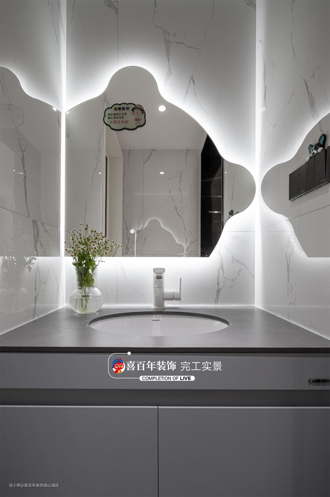 洗漱台是规规矩矩的柜台加台下盆设计,水渍卫生日常清理方便,墙镜设计比较有个性,放弃镜柜的搭配,选用这种颜值更高,四周嵌入的灯带让日常化妆也不在怕的。