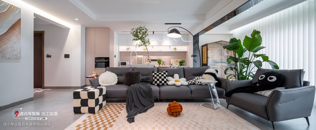 近看客厅,通过暖色灯光和软装系列的颜色冲击,整个一温柔住了,看似杂乱的抱枕又格外和谐的在一起。