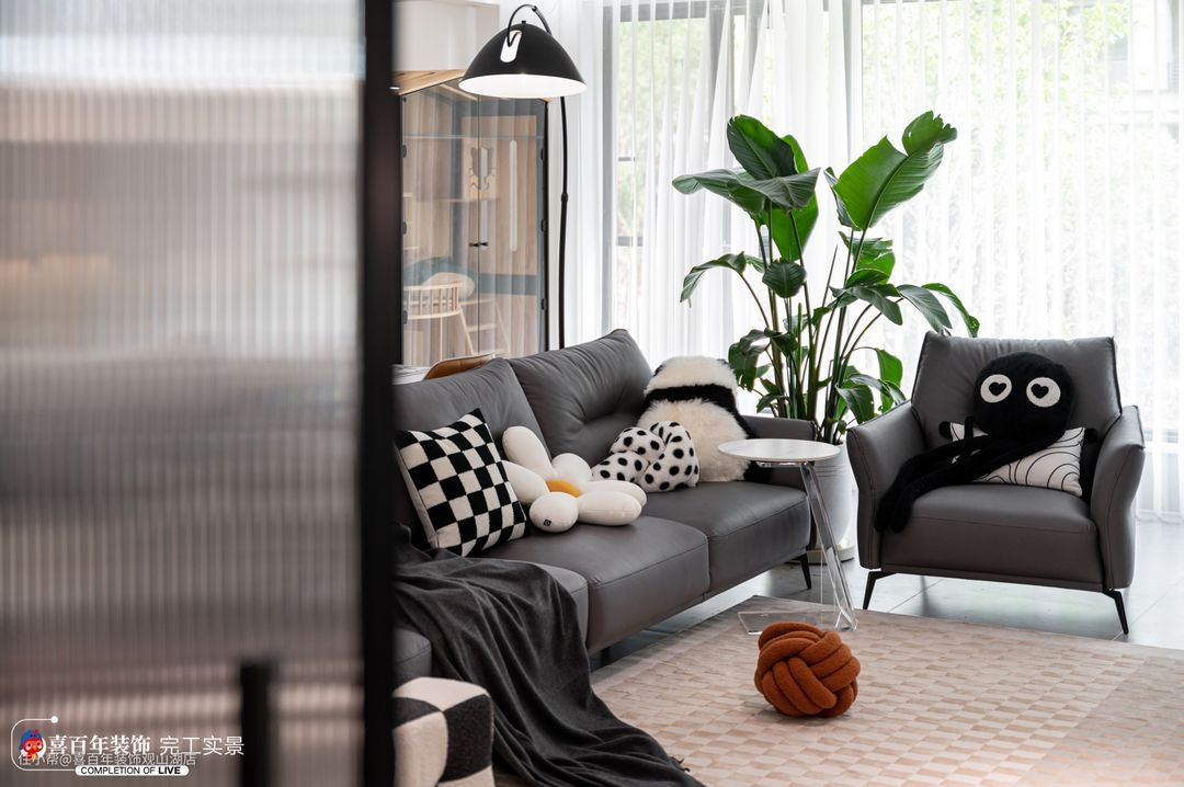 软装上的选择上,这里用黑色的皮质沙发加上各类颜色和不同形状的抱枕,给古板的黑色增加机灵和活泼色调,同时皮质沙发对于日常清洁来说也是非常友好的。