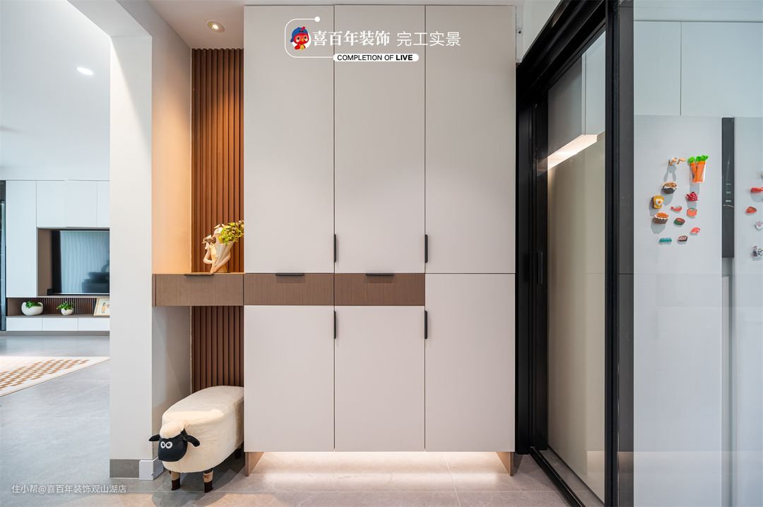 入户玄关上没有特别的隔断出来,就在进门正对这的地方做一面墙柜收纳,底部设计灯带照明,既可以是装饰感也实用。