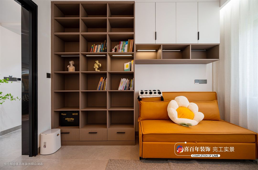书桌后面墙柜靠窗还嵌入一张沙发床,日常收起来是一张舒适小沙发,家里客人多的时候扯出来就是一张小床,方便朋友留宿居住。因为现在亲戚朋友都是偶尔串门,就没有必要为了一两次的留宿留出客房。