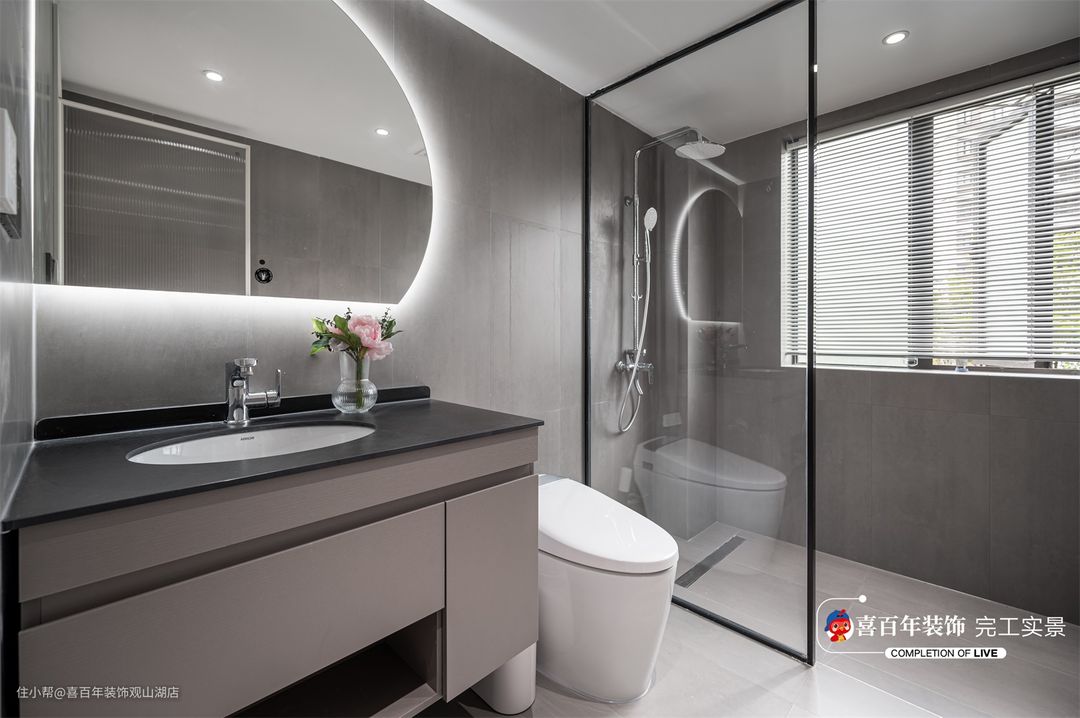 主卧卫生间的格局与客卫差不多,淋浴区用玻璃门隔断减少水渍。