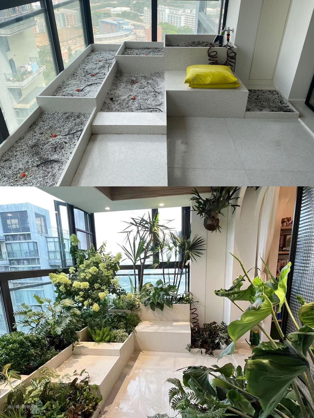 花台刚砌好和第一批绿植栽上的效果。