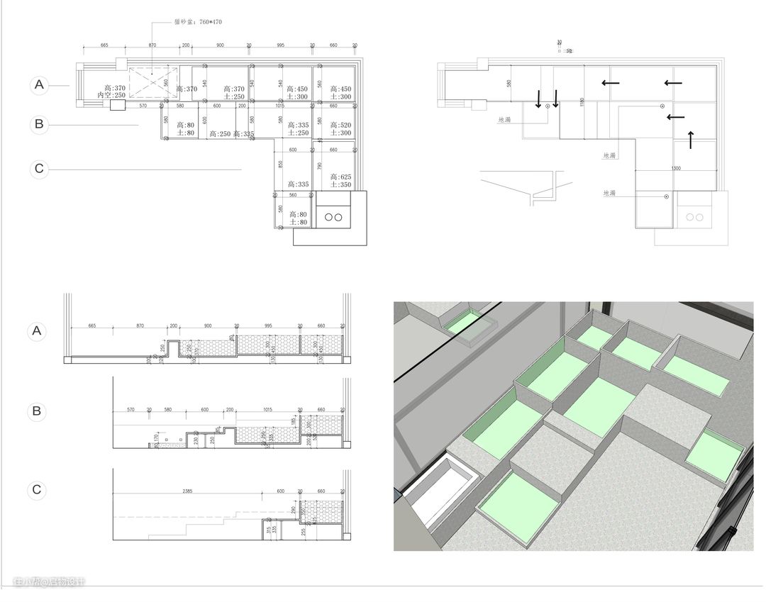 附花坛尺寸细节。核算完结构承重选用水磨石砌筑,覆土用陶粒混合减少荷载,架空底板用轻质水泥板,底面做屋面防水规格。