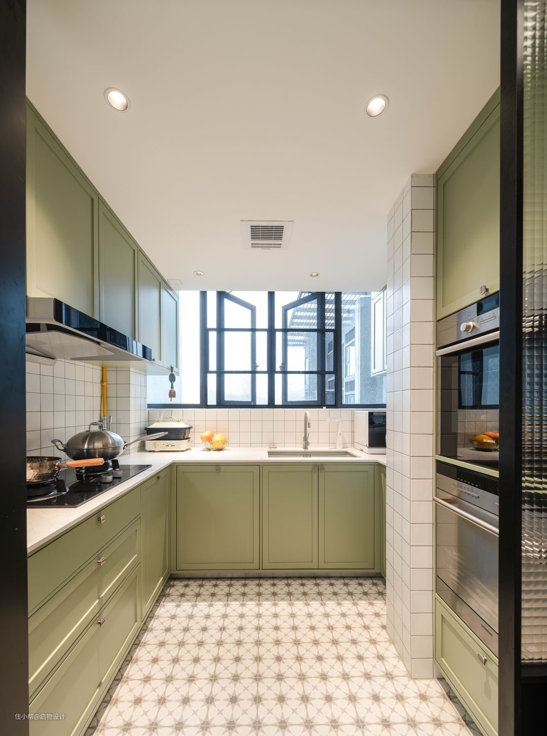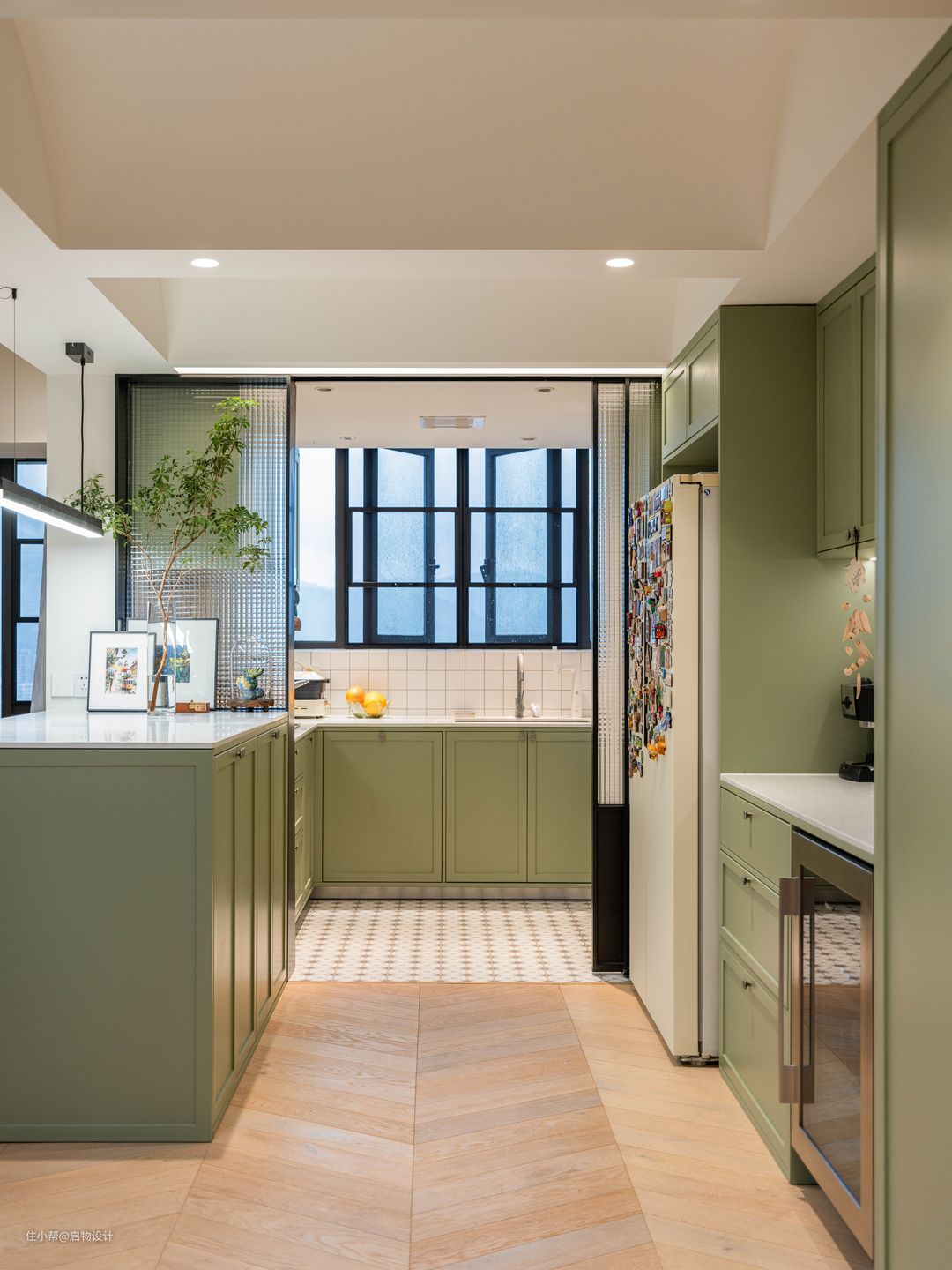 中厨与西厨藉由小花砖和黑色移门区分过渡。玻璃移门藏在电器高柜和双门冰箱之间,通透材质的连接弱化两个高大物件的厚重体量。