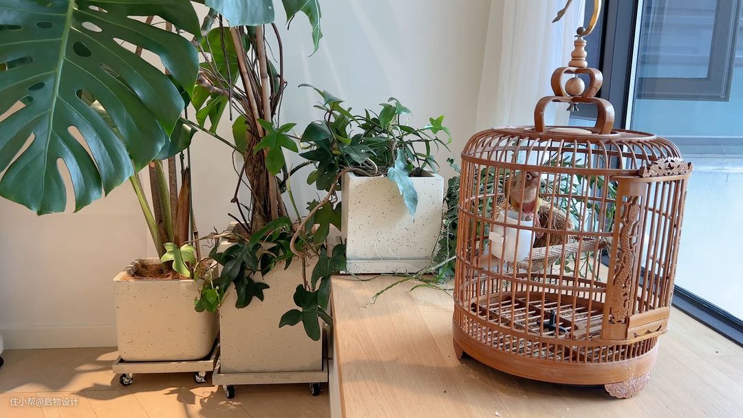 空间所有靠窗有阳光的位置都预留了绿植的位置。落地的大件植株用可移动托盘方便挪动养护,半高的飘窗台养殖小盆栽,为鹦鹉哼哼打造一片小森林。