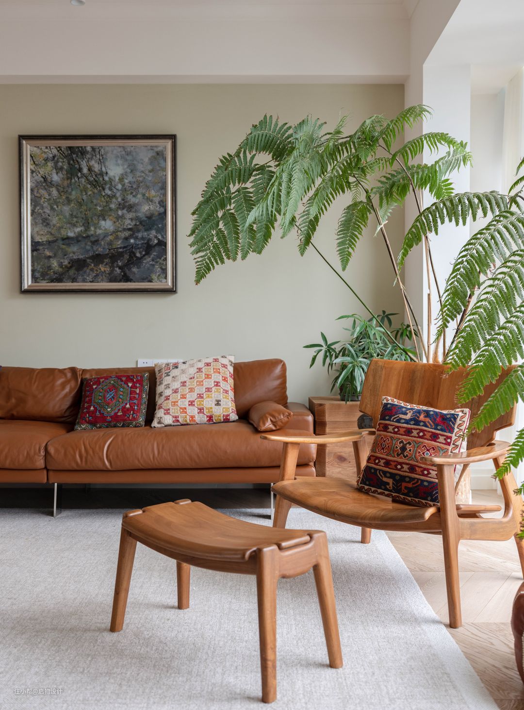 活动家居藉由大面积的米灰色地毯柔和过渡,围合可坐可躺可卧的写意空间。