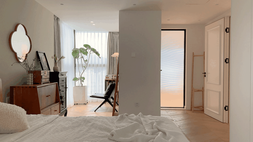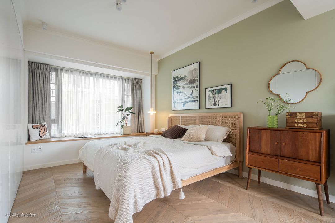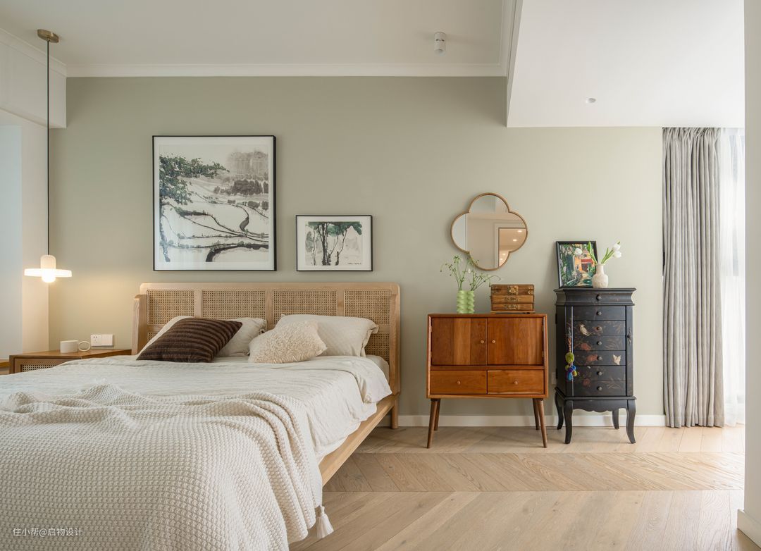 藉由家居单品来展示空间魅力和主人气质。藤编床榻与亚麻床品铺展睡眠区,中古撞色斗柜组合搭配梅花镜花梨首饰盒装点女主人的精致日常。