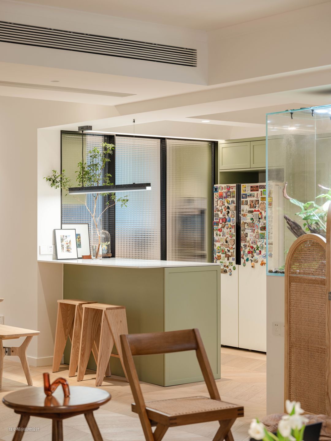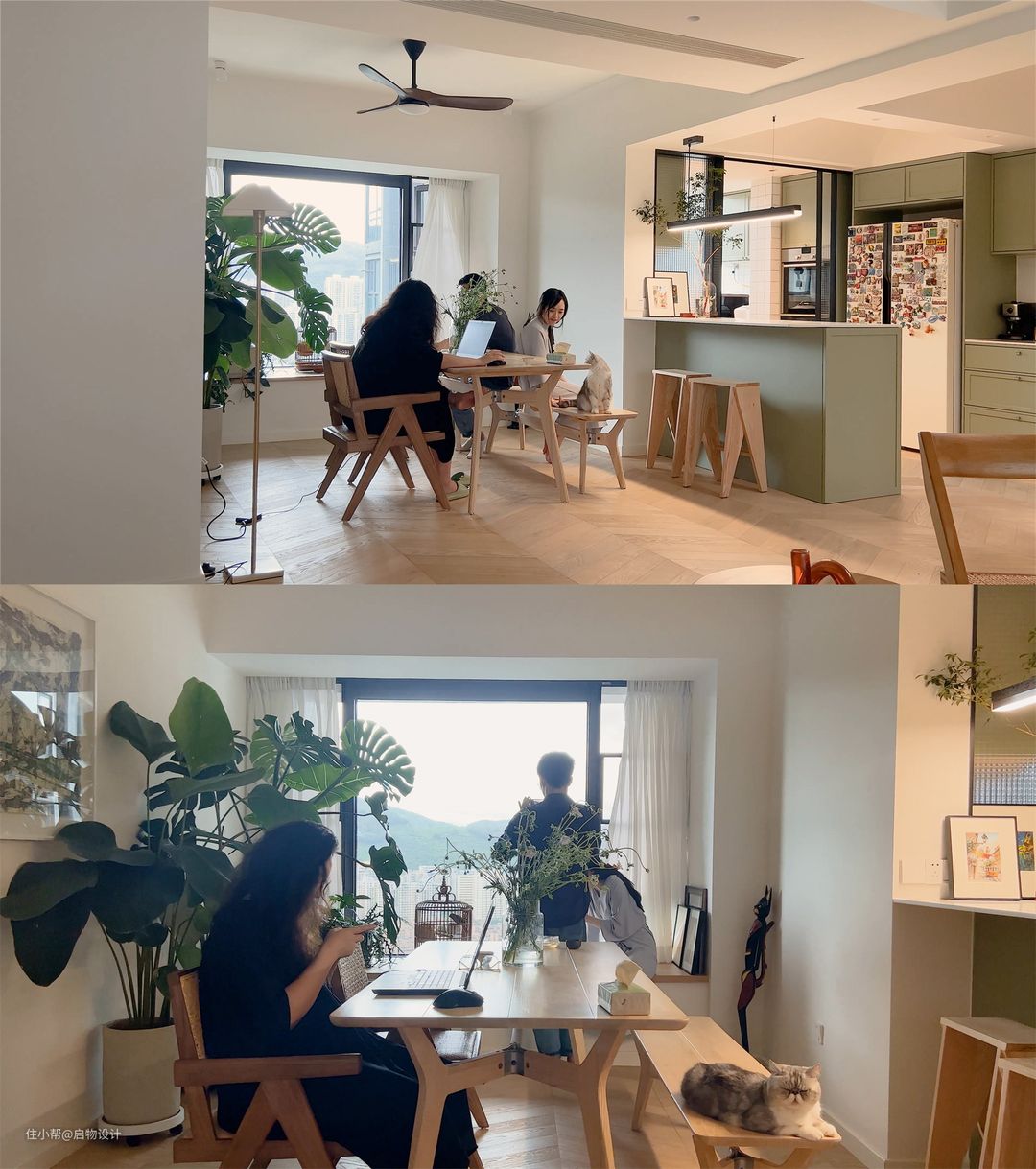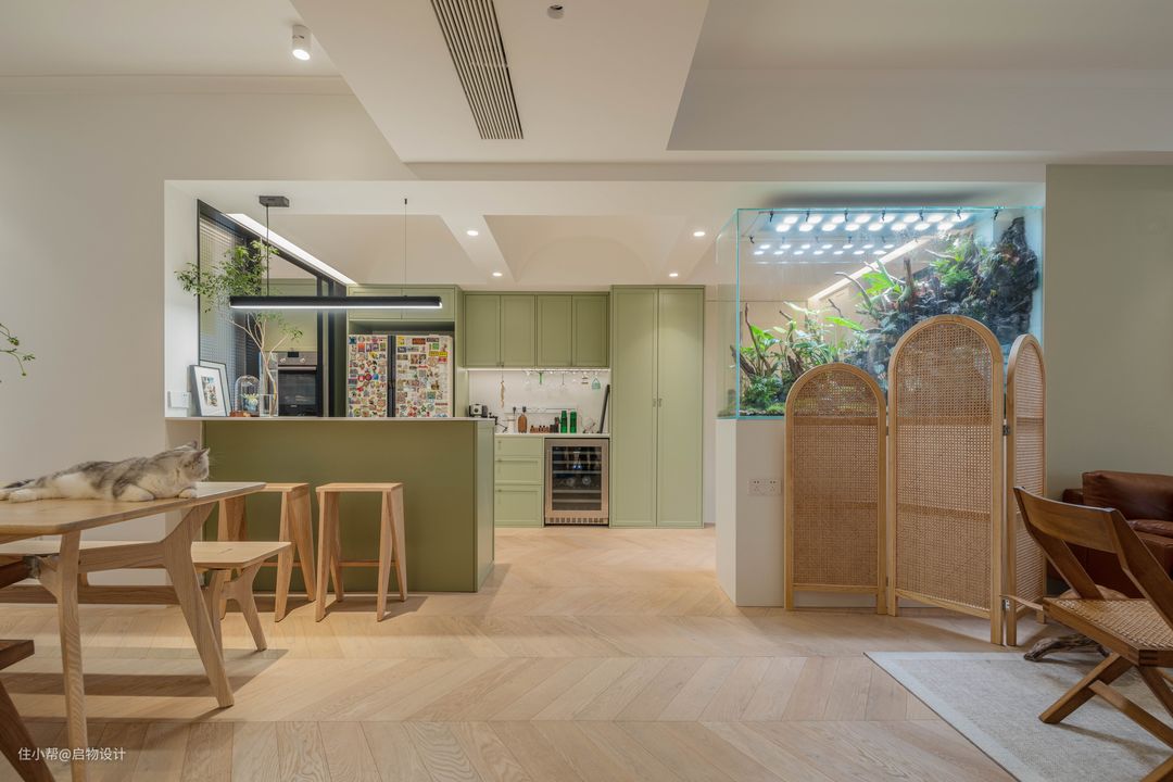 新房是精装交付,前屋主装修不久,除了风格老陈审美不符,饰面工程和配套的家具都是崭新的,将就也能住下。偏偏Germany是个极细致有品质追求,非常热爱生活且喜欢折腾的人,为了打造更符合自己需求和审美的居住空间,毅然决然大拆大改。 Germany是景观建筑师,喜欢植栽和小动物,爱好品酒饮茶,热爱旅游衷情自然...先生是工程师,家有爱宠两枚——加菲喵糖和鹦鹉哼哼。新房以Germany超爱的绿植为设计主轴,把其对自然的尊崇和向往融合在了新家的装修设计中。随处可见的绿意和生命力,以及各种有温度有记忆的物件...无不承载着居住者对生活的无限激情和热爱。 秉持不浪费有记忆、实用与艺术兼并,可变式空间设计原则,我们在最繁华的都市中心共同打造了一个有温度的森系氧吧住所。