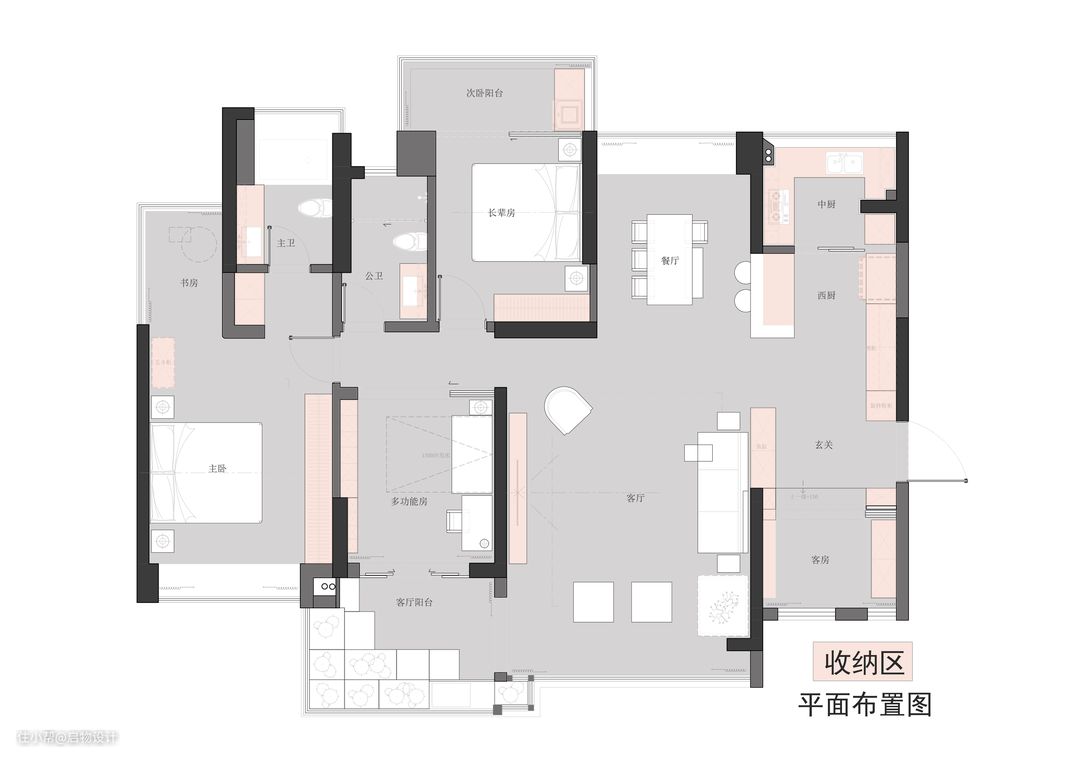 收纳墙体连接休闲区和主卫,为注重生活品质细节的屋主实现独立完善且灵活自由的私密套间。