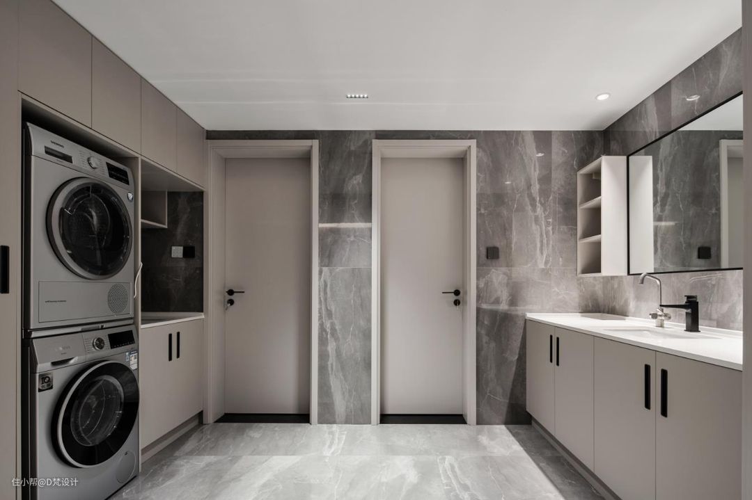 专用的只服务于卧室,整个洗手间光线色调偏暗,白色的台面和台盆搭配黑色水龙头,不失奢华之美,身处其中,有一种静谧安宁的舒适感。