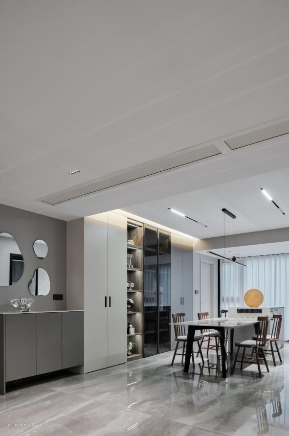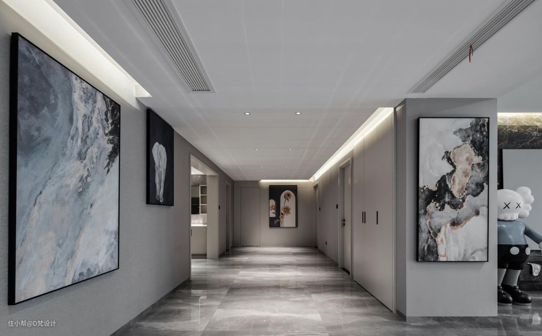 设计元素整体统一呼应,删繁就简,科学分道,以笔直路线导引去向不同区域的步伐。无主灯设计与嵌入式灯带配合,提供了温和舒适的光源,凸显精选出来的艺术品,高高低低,有疏有密,诉说着深刻的艺术思想。