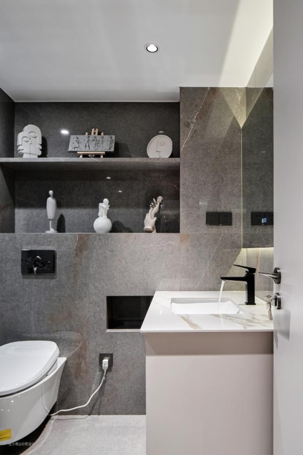 专用的只服务于卧室,整个洗手间光线色调偏暗,白色的台面和台盆搭配黑色水龙头,不失奢华之美,身处其中,有一种静谧安宁的舒适感。