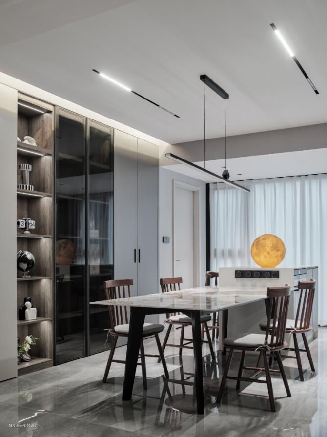 阐述变化的奥义,于黑白灰画面里穿插深木色餐椅,交织出文化与自然的独特性,绽放了石纹的亲切情愫与剔透饰面的灵动美感,刻录下美酒佳肴映入眼眸,流转鼻尖,触动多重体验。