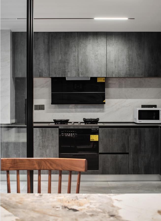 厨房中有着人间最温暖的烟火气,深色门板和岩板台面结合,不仅耐脏,而且兼具颜值和内涵,使厨房成为你展示个人品位的重要领地。