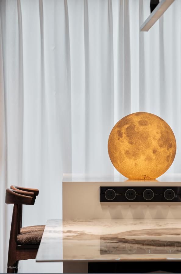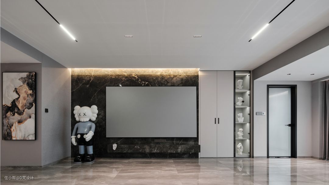 设计元素整体统一呼应,删繁就简,科学分道,以笔直路线导引去向不同区域的步伐。无主灯设计与嵌入式灯带配合,提供了温和舒适的光源,凸显精选出来的艺术品,高高低低,有疏有密,诉说着深刻的艺术思想。